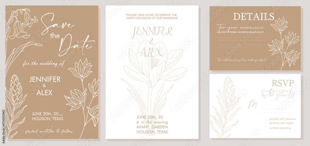 Elegant flat vector wedding invitation set with Save the Date, RSVP, and Details cards. Minimalist botanical design with trendy golden wildflower line art on neutral background #1730553967