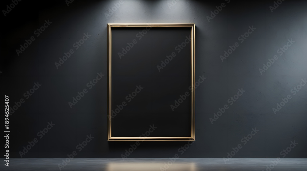 Empty gold metal picture frame on dark black wall, art gallery mockup background with copy space #1894525407