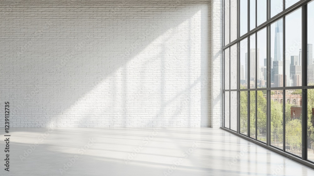 Empty white brick wall interior with tall windows, mock up, beautiful sunlight coming from the window #1239112735