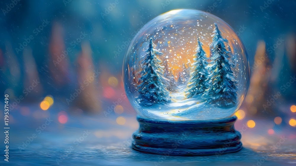 Enchanting Christmas Snow Globe with Curved Fir Trees and Vibrant Brushstroke Style Creating a Luminous Holiday Winter Scene #1795371490