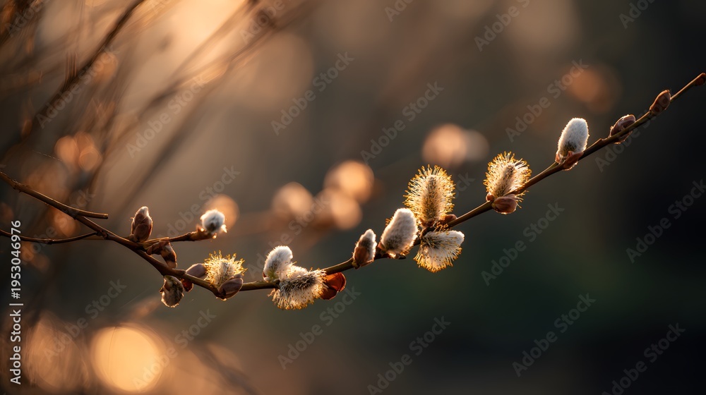Enchanting Willow Branch with Soft Catkins in a Mystical Forest at Sunset Radiating the Subtle Symbolism of Easter #1953046976