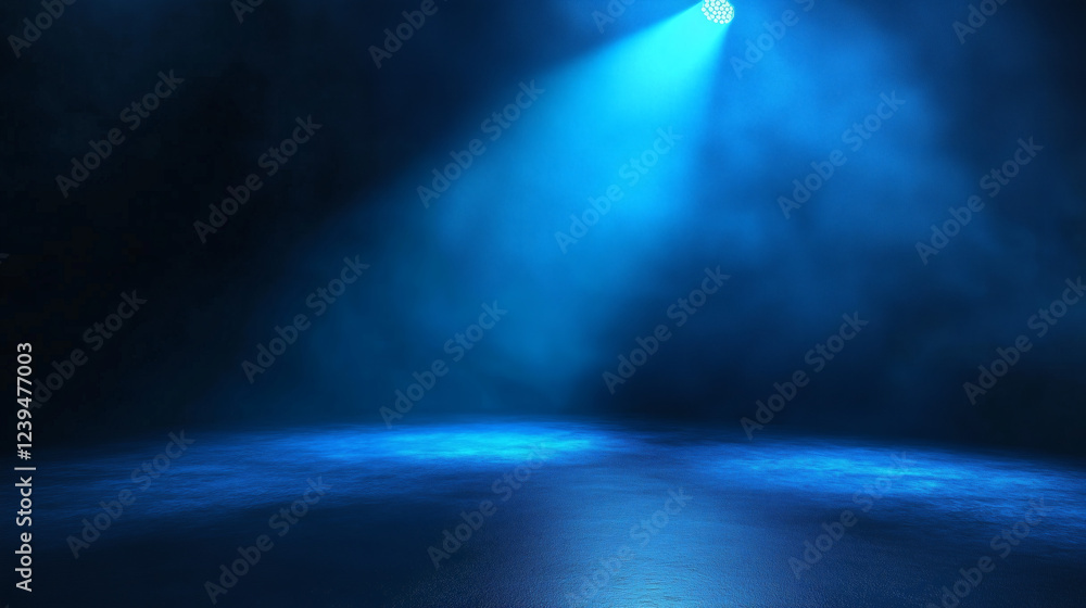 Escenario iluminado con luces azules en ambiente oscuro y brumoso. #1239477003