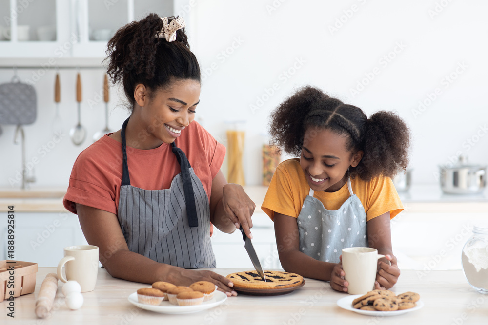Excited black mom and daughter in aprons tasting homemade berry pie, cutting cake and smiling, kitchen interior. Happy african american mother and kid teen girl baking together at home, copy space #1888925814