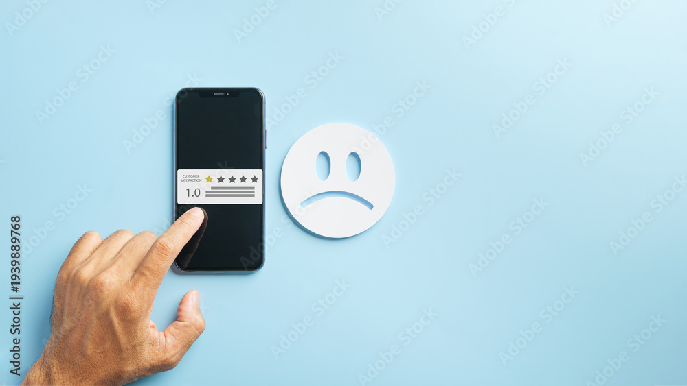 Experience poor customer service, hand inputs negative online review on mobile phone, displaying one star feedback rating for low satisfaction, with prominent unhappy face #1939889768