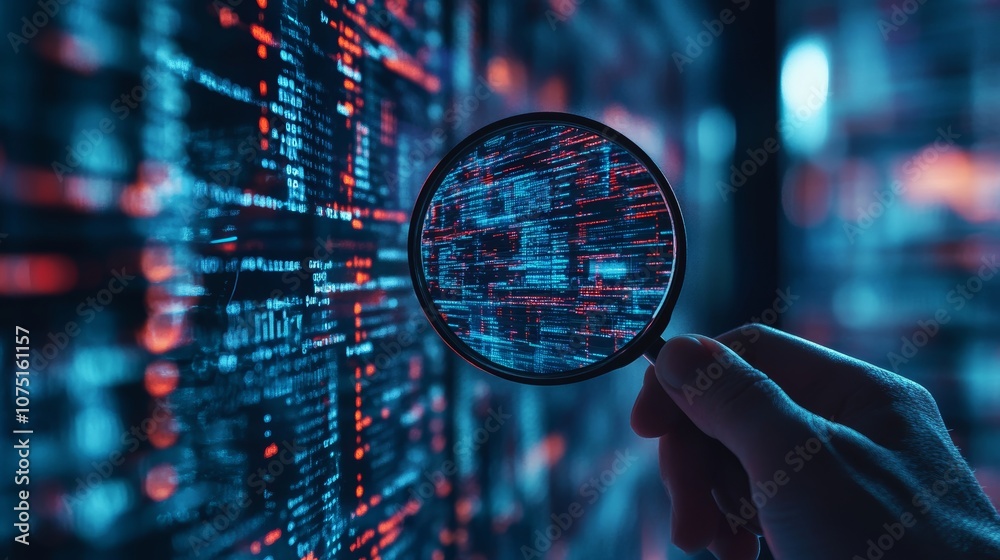 Exploring digital code a hand with a magnifying glass represents data analysis and software testing #1075161157