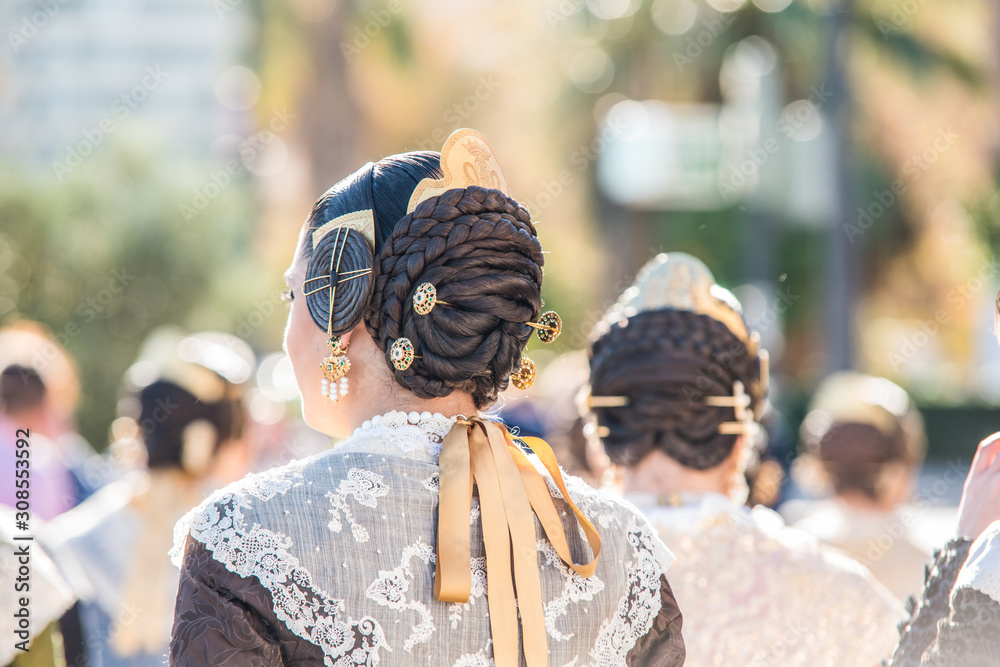 Fallera hairstyle detail, typical celebration of Valencia on a sunny day #308553592