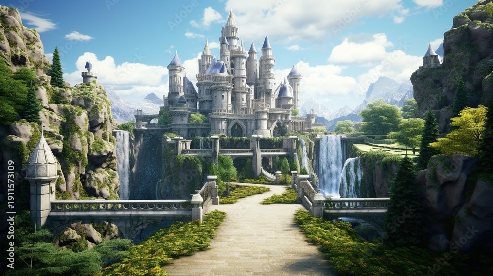Fantasy Castle on a Cliffside Realm with Cascading Waterfalls and Lush Gardens #1911573109