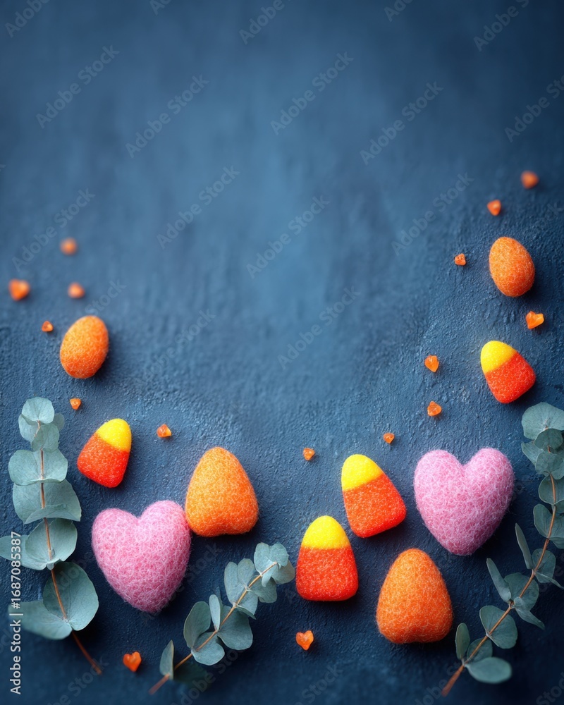 Felt Candy Corn, Hearts, Eucalyptus - Dark Teal Background, High-Angle Shot #1687085387
