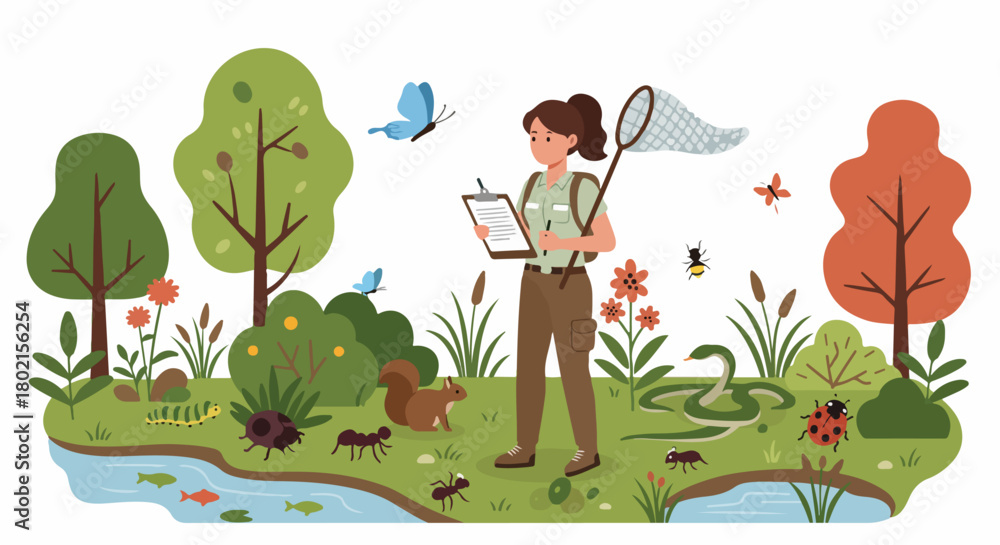 Female biologist explores diverse ecosystem, observing insects, animals, and plants, documenting nature's vibrant biodiversity with a net and clipboard. #1802156254