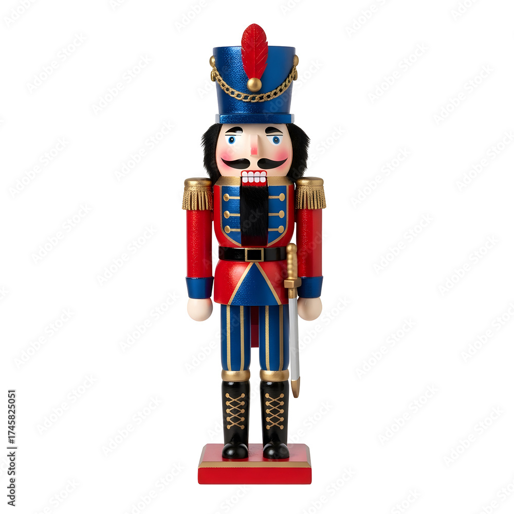 Festive full shot of a wooden nutcracker figurine on a black backdrop. It features red and blue coloring, is isolated and cutout. With clipping path. #1745825051