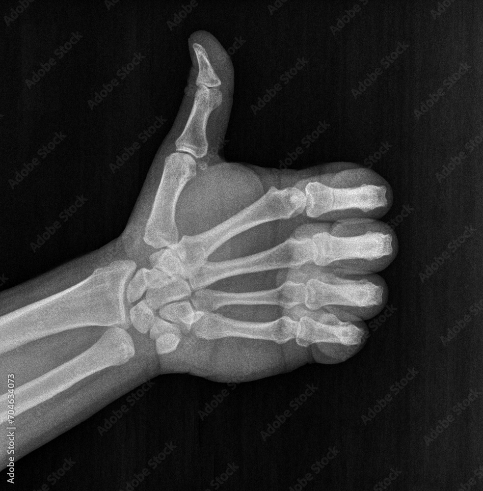 Film xray x-ray or radiograph of a thumb up associated with agreement, approval, confirmation or positivity in gestural language, manual communication, or signing aka sign language #704634073