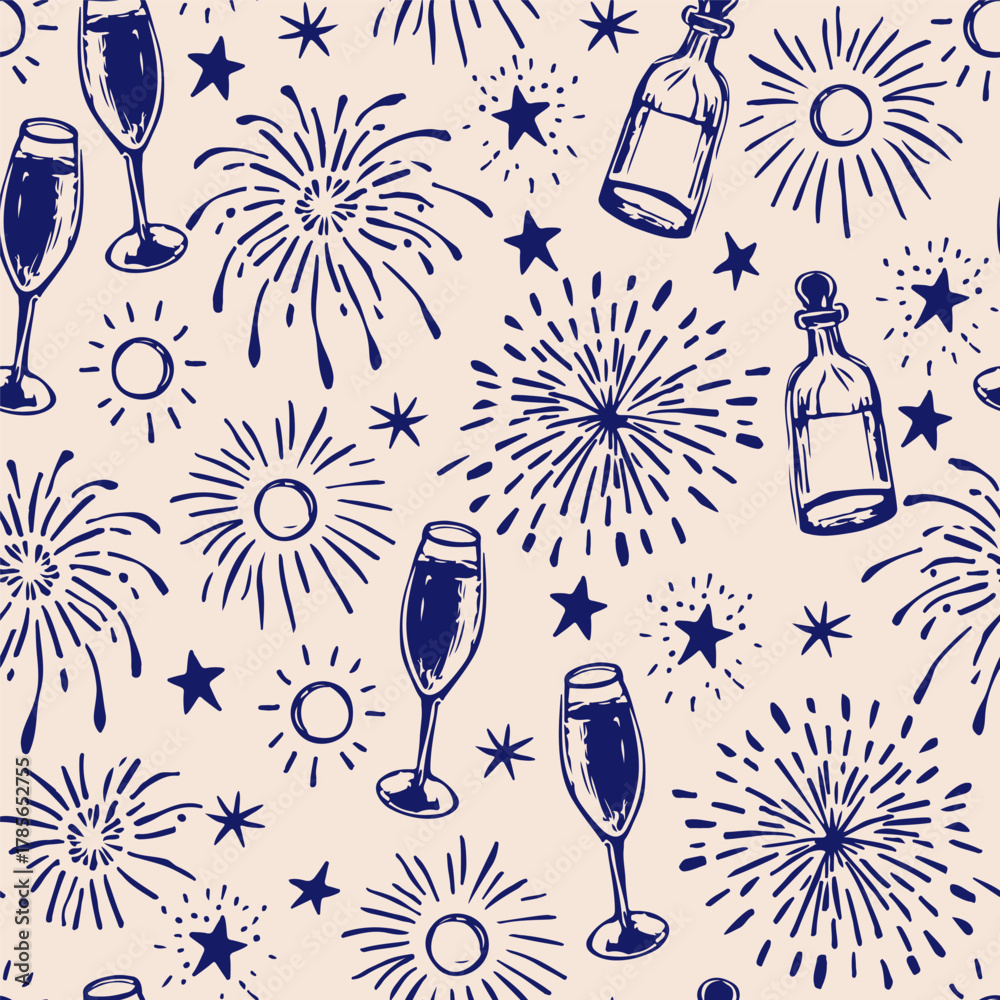 Firework, Wine Bottle and Wine Glass Seamless Pattern in Sketch Doodles Hand Drawn Style. Christmas and New Year Wallpaper in Doodle Art Style. Fireworks Template for Holiday, Party, Celebration #1785652755
