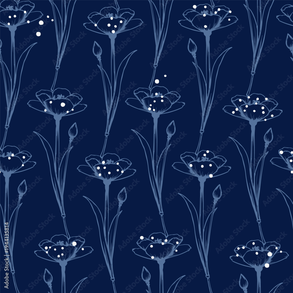 Floral Seamless Pattern. Abstract Botanical Background. Dark Blue Monochrome Flower Seamless Pattern Line Art Style. Minimalist Vector Floral Print Design for Fabric, Textiles or Wallpapers. #1944135814