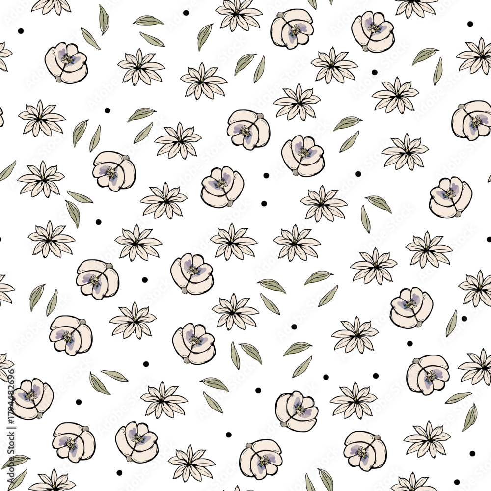 Floral Seamless Pattern. Cute Flowers Wallpaper Background Design. Botanical Template for Textile, Fabric, Print, Banner, Web, Social Media. Vector Illustration #1794482696