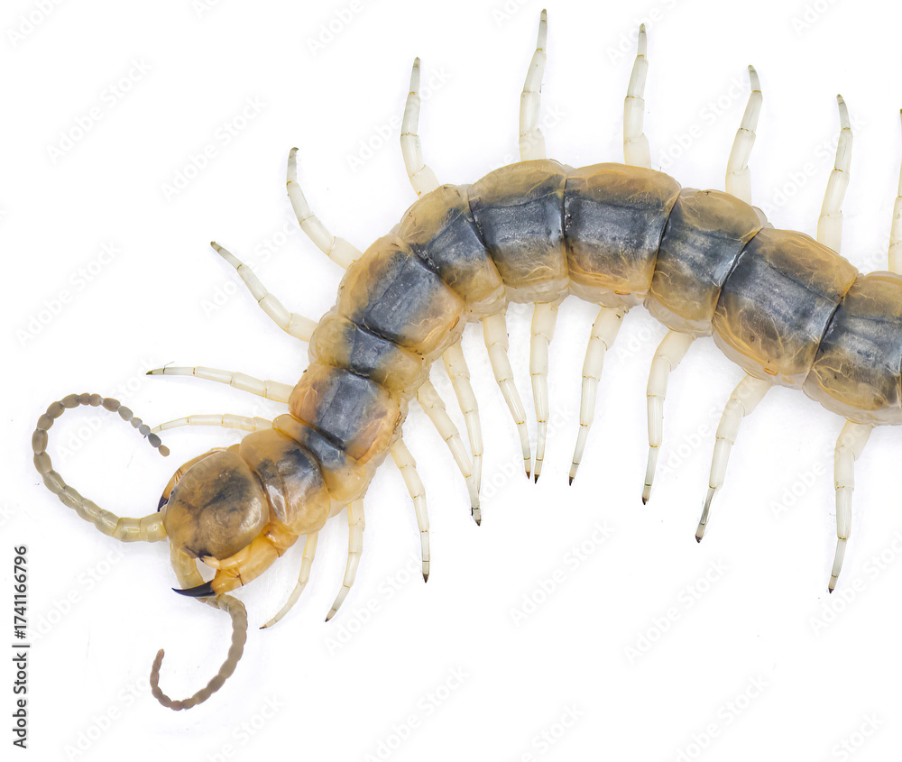 Florida Blue centipede - Scolopendra viridis - are venomous and can inflict painful stings, injecting their venom through pincer-like appendages known as forcipules or toxicognaths. Isolated white #1741166796