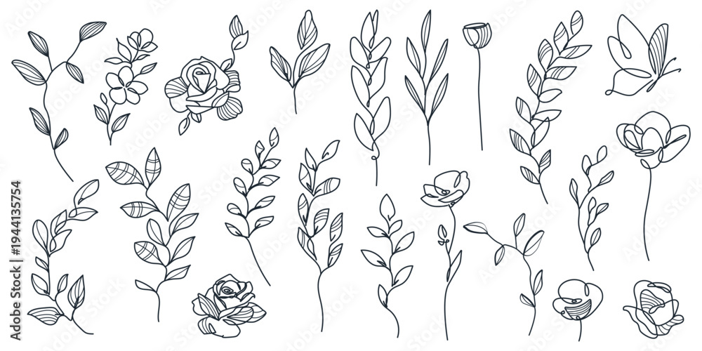 Flowers and Leaves Set Line Art Drawing. Hand Drawn Floral Plant Vector Illustrations Collection. Line Art Graphic Simple Leaf and Flowers Art Drawing. Botanical Doodle Minimalist Design #1944135754