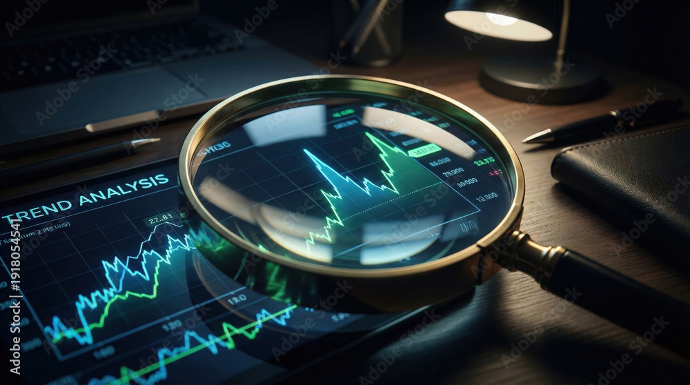 Focused magnifying glass checking stock market chart depicts serious financial analysis strategy. Digital business investment data research aids trading growth economic graph for profit success #1918054541