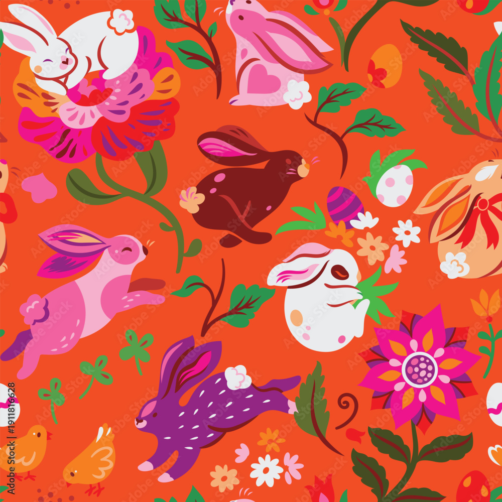 Folk Garden Easter Bunnies isolated on orange seamless pattern #1911816628