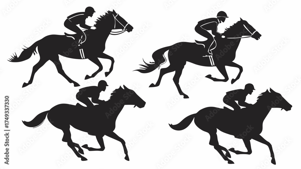Four dynamic black and white vector silhouettes of horse racing jockeys and horses in full gallop, showcasing equestrian sport action. #1749337330
