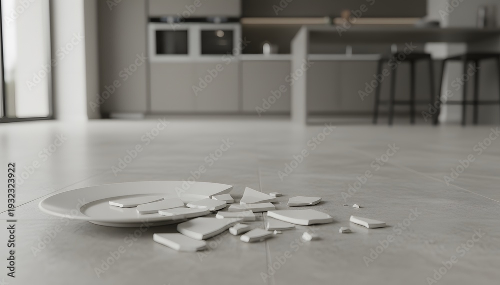 Fragments of a white broken plate scattered across a modern kitchen floor, representing an unexpected accident concept or domestic stress #1932323922