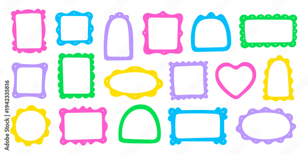Frame border hand drawn cute set. Cute doodle frame border square, rectangle line photo picture shapes. Cartoon children kids bow scallop lace stamp retro vintage card. Vector illustration #1942335816