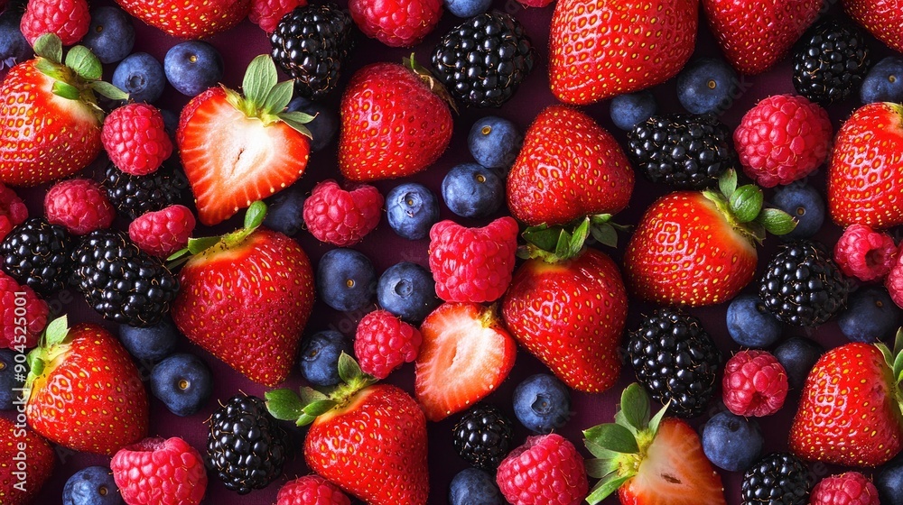 Fresh and colorful assortment of strawberries, blackberries, raspberries, and blueberries, cut out #904525001