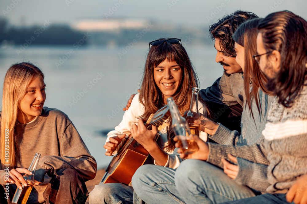 Friends enjoy a sunny day by the river while one plays guitar and others share drinks and laughter #1907305052