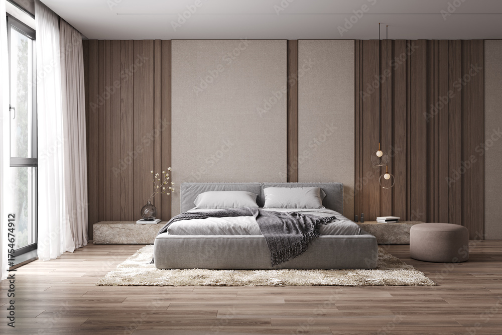 Front view minimalistic bedroom interior mockup, 3d render #1754674912