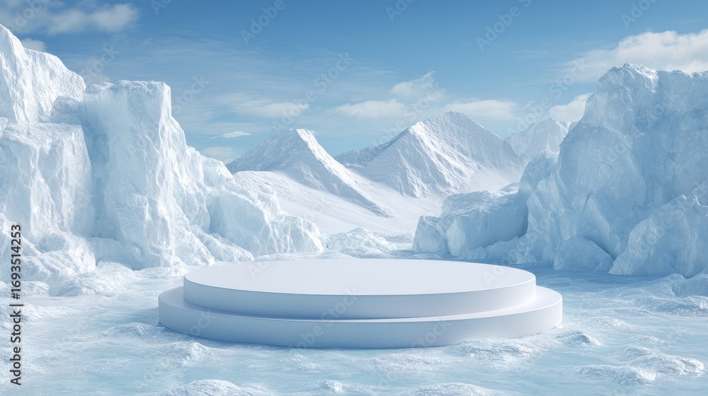 Frozen ice podium display with snowy winter mountain background, minimal 3d pedestal platform for product presentation, cool blue sky scene with frozen landscape, white glacier rock stand for cosmetic #1693514253