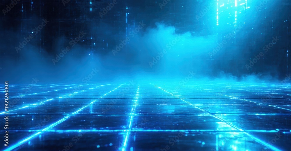 Futuristic grid floor glows brightly. Blue light dominates scene, fog obscures distant details. Digital aesthetic creates immersive space. #1921260801