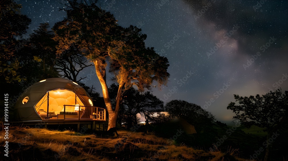 Geodesic dome glamping tent under starry night sky for unique travel experience. #1919141415