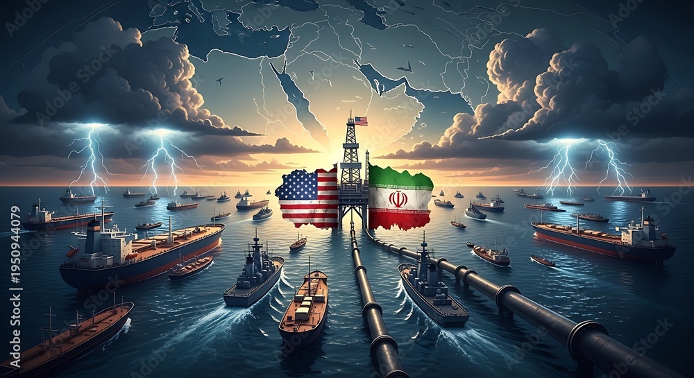 Geopolitical Tension Between USA and Iran in the Strait of Hormuz with Naval Presence and Lightning. #1950944079