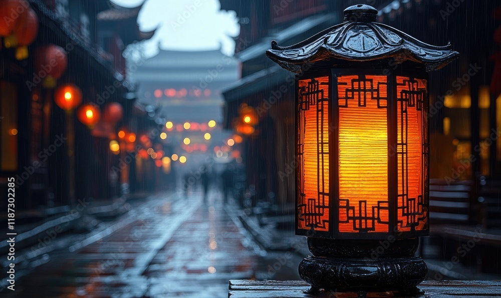 Glowing lantern illuminates rainy ancient Chinese town street at dusk. #1187302285