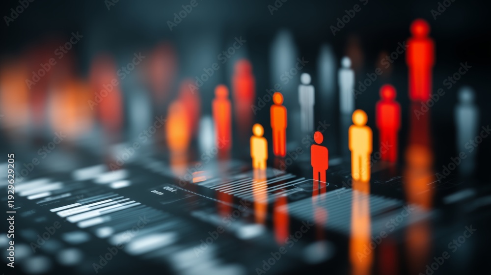 Glowing orange and red human figure icons stand on digital interface with integrated bar chart overlays, depicting population demographics and social statistics for targeted marketing analysis. #1929629205