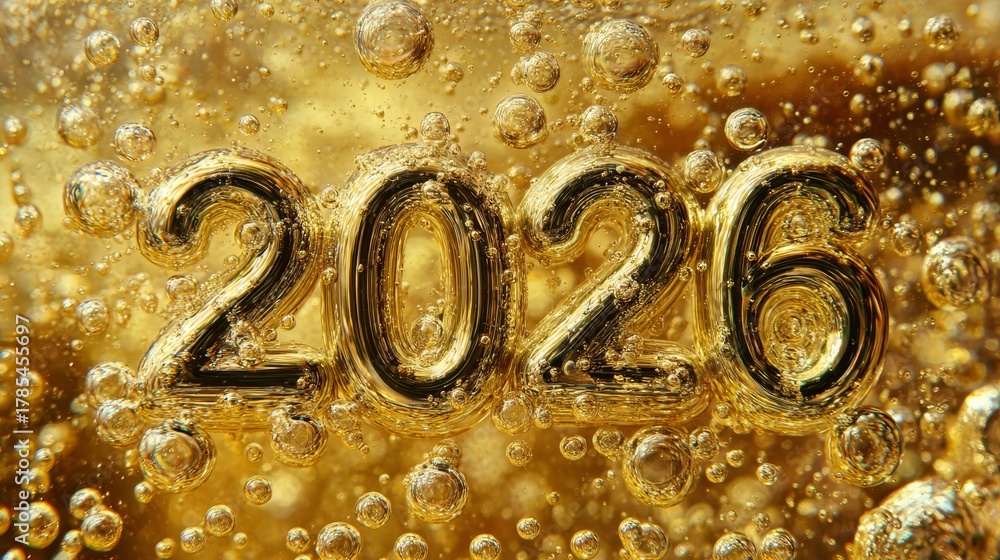 Golden champagne bubbles with NEW YEAR 2026 text floating in sparkling liquid. New Year background #1785455697