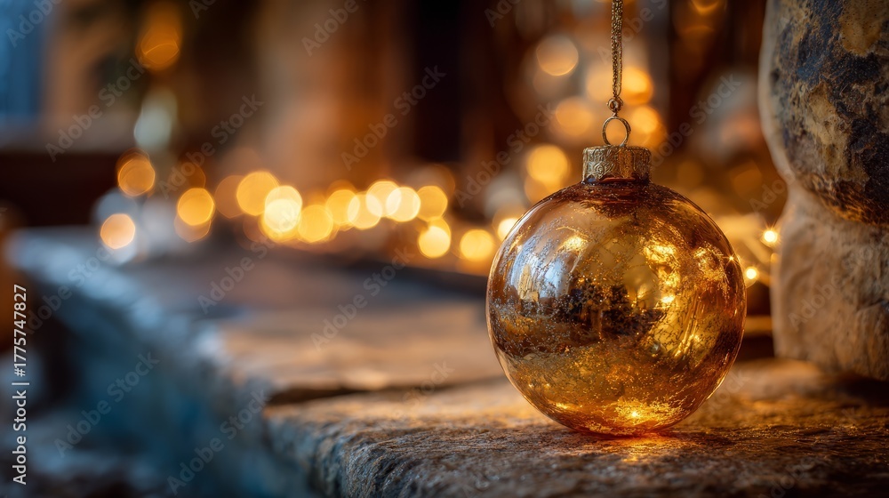 Golden Christmas ornament reflecting firelight on stone hearth. Cozy winter evening #1775747827
