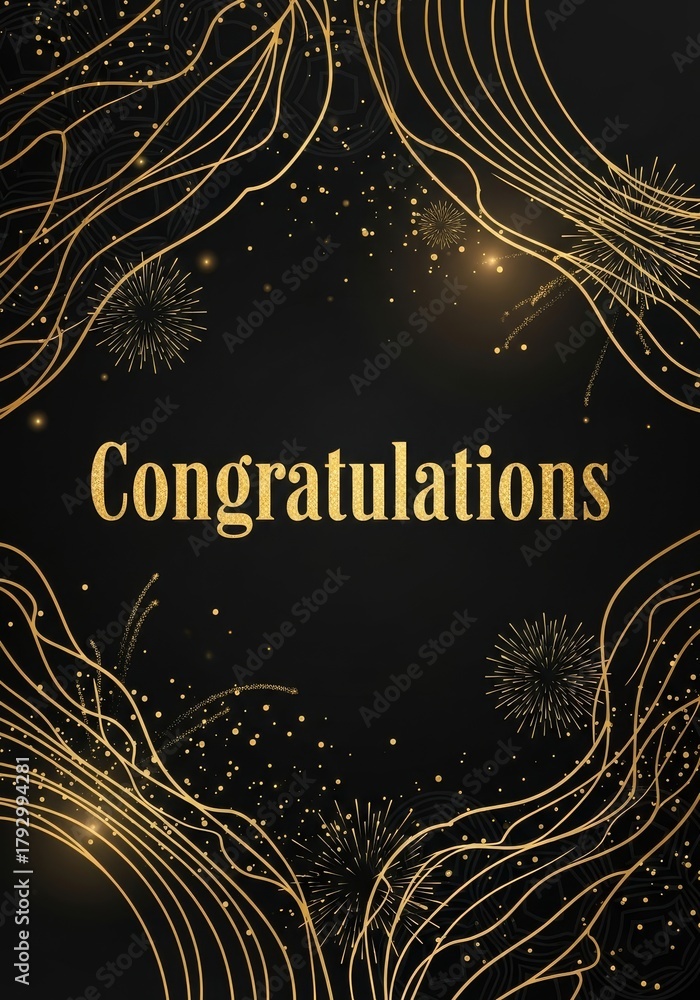 Golden Congratulations Greeting Card - Elegant congratulations card with golden details and fireworks on a black background #1792994281
