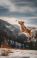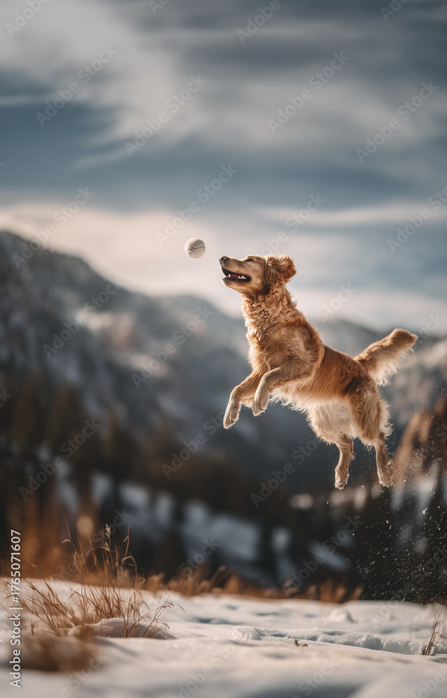 Golden retriever energetically leaps to catch a ball amidst snow-covered mountains, embodying joy and playfulness in a winter landscape. Image made using Generative AI. #1765071607
