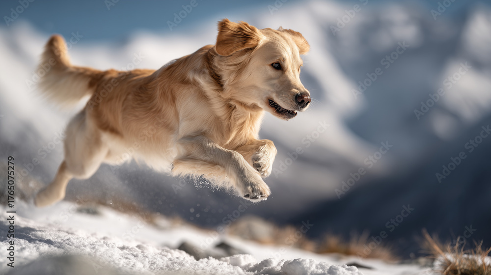 Golden Retriever Leaping Through Snowy Mountain Terrain in Winter Landscape Scene. Image made using Generative AI. #1765075279