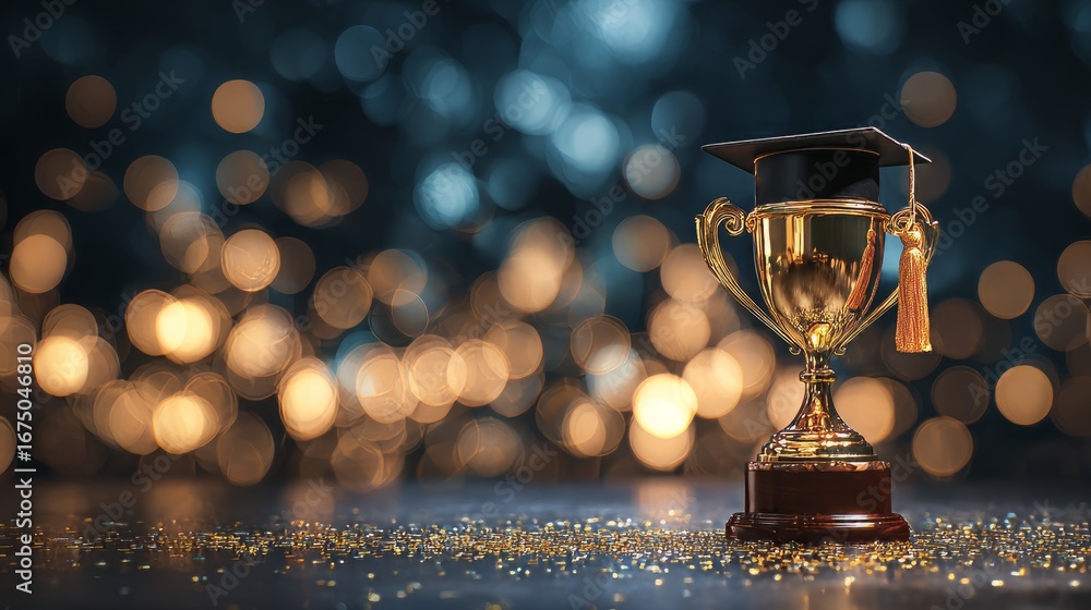 Golden trophy cup symbolizing academic achievement and success in education awards, celebrating university graduation, student excellence, and scholarly recognition against a festive bokeh background #1675046810