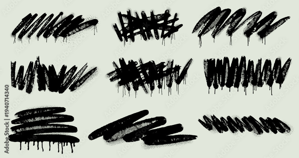 Graffiti spray paint squiggly lines with drips, splatters. Curly loop stroke, bold brush underlined, ink blots with aerosol effect. Grunge clipart hand drawn street elements for poster, sticker, cover #1940714340