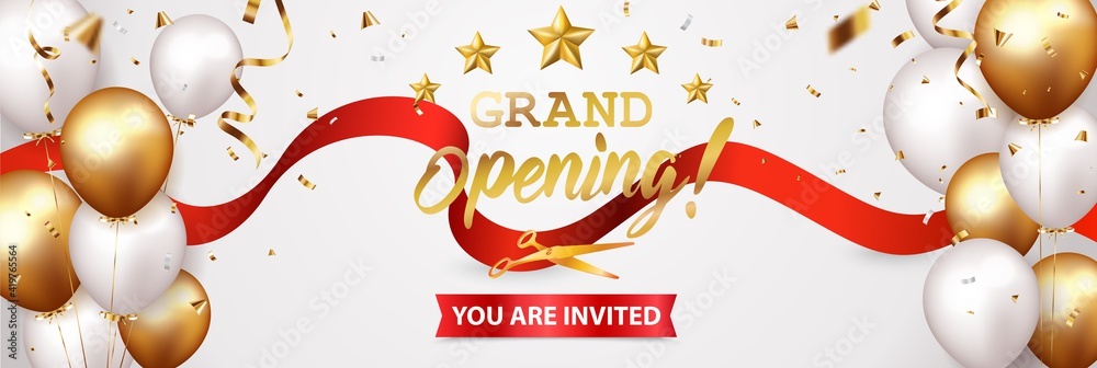 Grand opening card design with gold ribbon and confetti #419765564