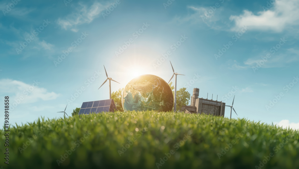 Green earth with solar panels wind turbine and factory skyline inspiring environmental awareness #1938918558