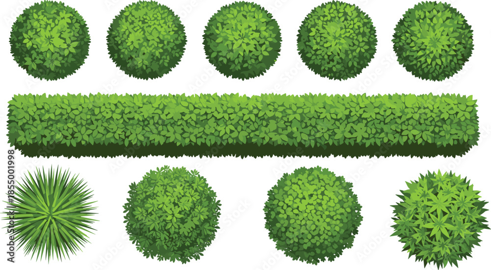 Green garden bushes and hedges top view set with round shrubs plants foliage elements for landscape design illustration #1855001998