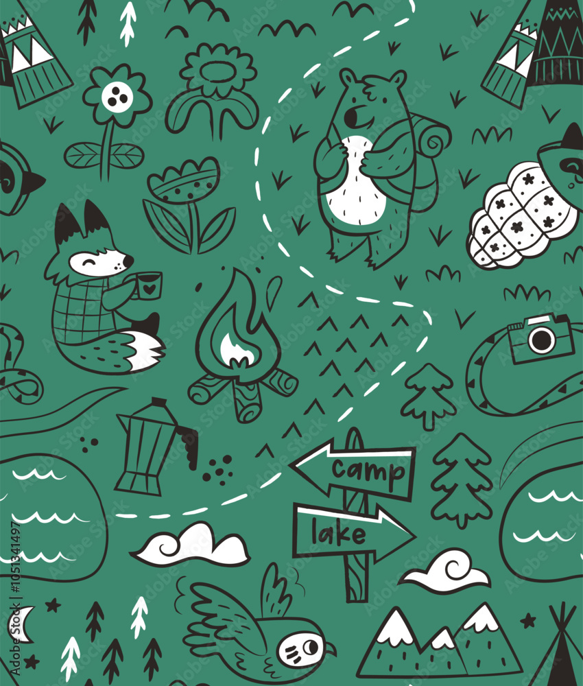 Green graphic map with cartoon animals. Seamless pattern #1051341497