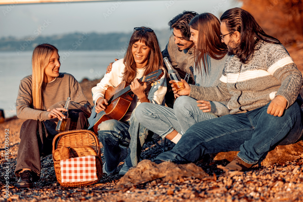 Group of friends gather on the beach during sunset for a picnic and music by the water's edge in a relaxed environment #1907305162