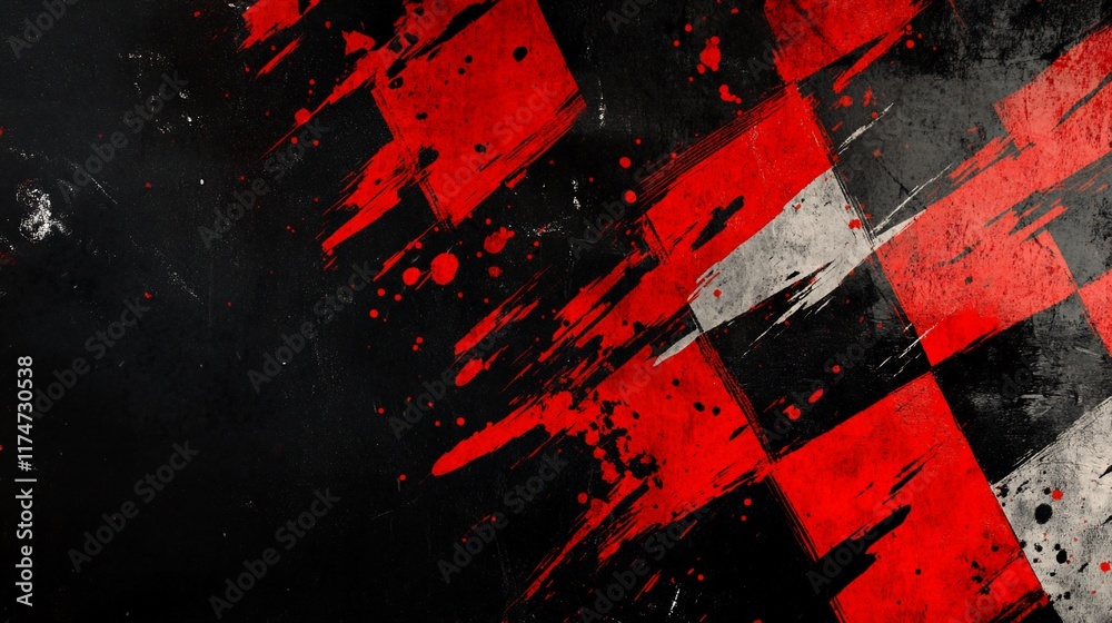 Grunge checkered flag with red and black distressed paint splatter. #1174730538