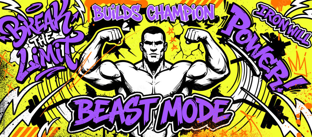 Gym guy showing his muscle with motivation graffiti text . Graffiti background art style #1934874935
