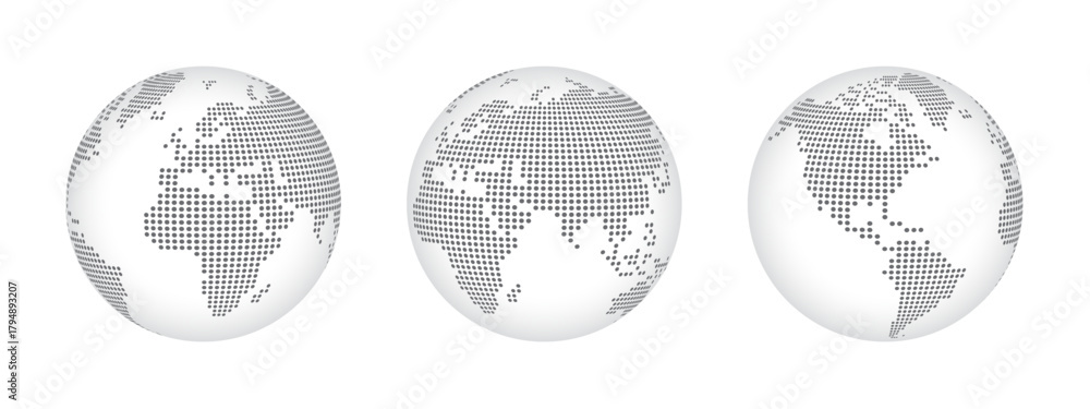 Halftone world map with dot pattern, dotted globe continents graphic, black and white Earth planet #1794893207
