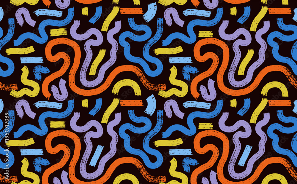 Hand draw seamless pattern grunge featuring intertwining curvy brush stroke lines. Seamless in varying shades of blue, yellow and beige creating a dynamic and modern, art abstract. Vector art pattern. #1950717039